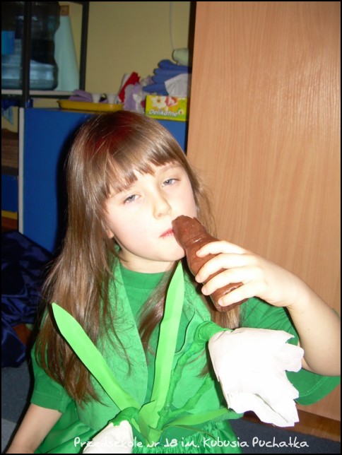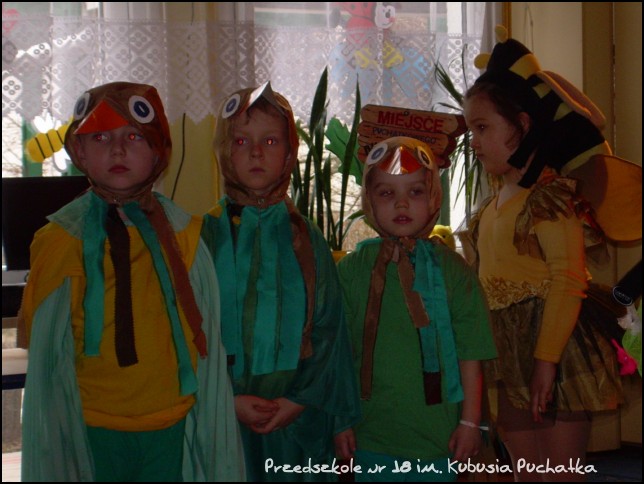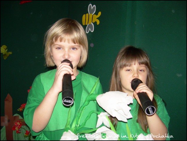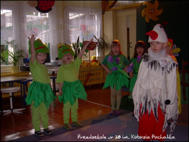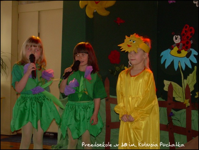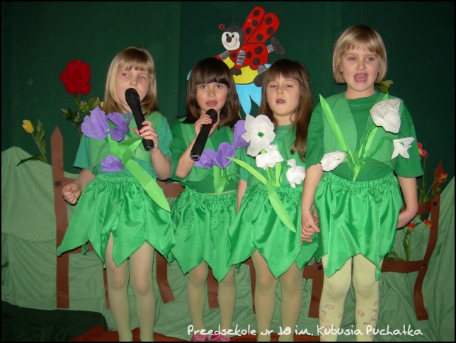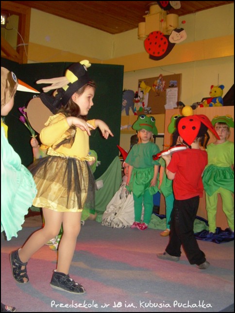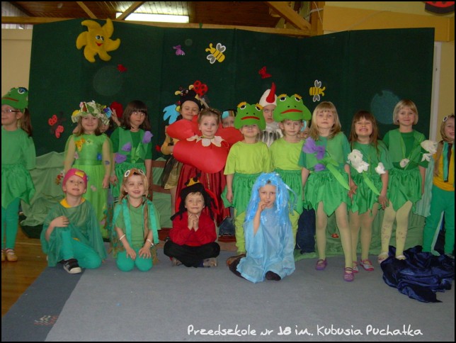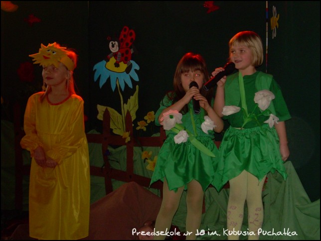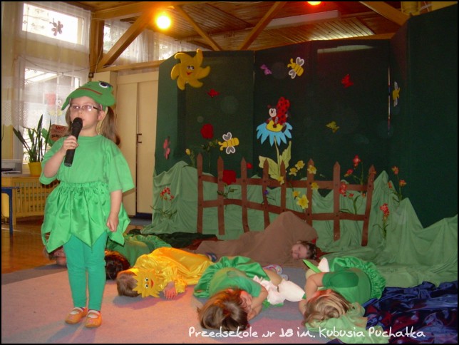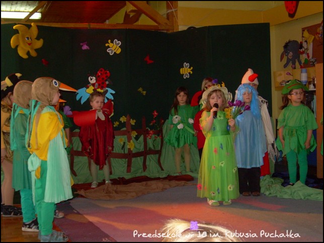 19.03.2010r. o godz. 15:00 przed licznie zgromadzoną publicznością "Daliśmy z siebie wszystko". Występ był bardzo udany i zachwyciliśmy rodziców znajomością tekstów, piosenek, tańcami i pięknymi kostiumami. W spektaklu wystąpiły: żabki, ptaszki, bocian, słoneczko, deszcz z kropelkami, nasionko, z którego wyrosła piękna malwa. Było też trochę śmiechu. Nasionko, w które wcieliła się Amelka, przykryta materiałem, poprostu zasnęła.