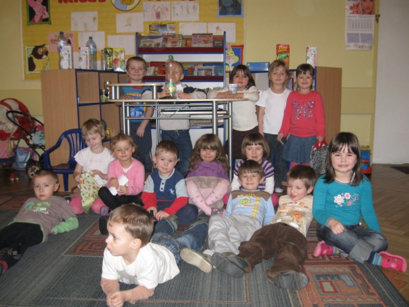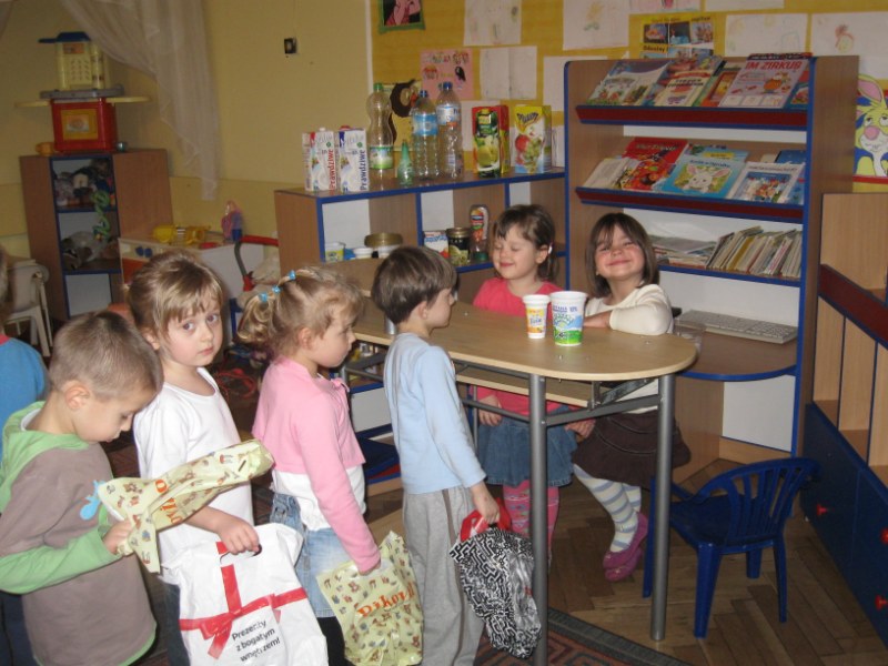 "Wielkie zakupy" - to jeden z tematów kompleksowych jakim zajmowaliśmy się w miesiącu Lutym. Wychodząc naprzeciw dziecięcym zainteresowaniom postanowiliśmy zorganizować kącik tematyczny "Sklep". Dzieci były bardzo zaangażowane w organizację i wyposażenie sklepu. Z domu przynosili pudełka, pojemniki po różnych artykułach spożywczych i przemysłowych. JAk przystało w sklepie były pieniądze, kasa a nawet "długie" kolejki. Dzieci chętnie wolny czas spędzały na zabawę w "sklep". Kupując produkty uczyły się przeliczać pieniądze, cierpliwie czekać w kolejce na swoją kolej oraz używały grzecznościowych słów: proszę, dziękuję.